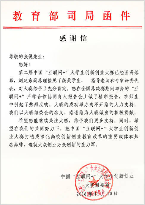 2018年,九球体育连续多年为中国国际互联网+大学生创新创业大赛做出积极贡献,获教育部来函致谢。